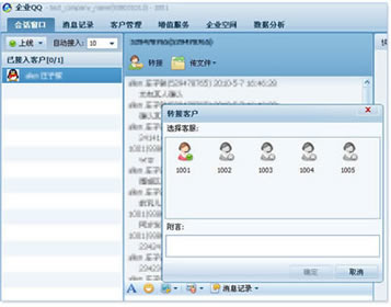 当客户咨询时,处于当前会话中的员工如果无法解决或者觉得由另一位员工更能为该客户服务,则可随时使用"客户转接"功能,可以很方便的由一个工号转到的另一个工号为此客户服务。